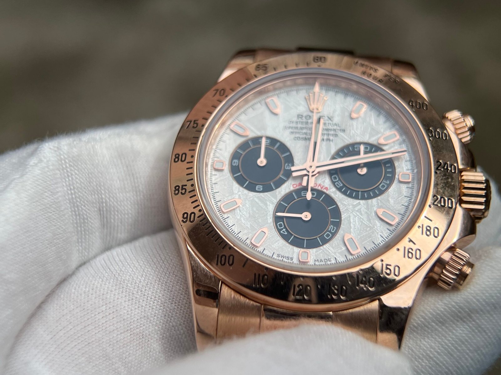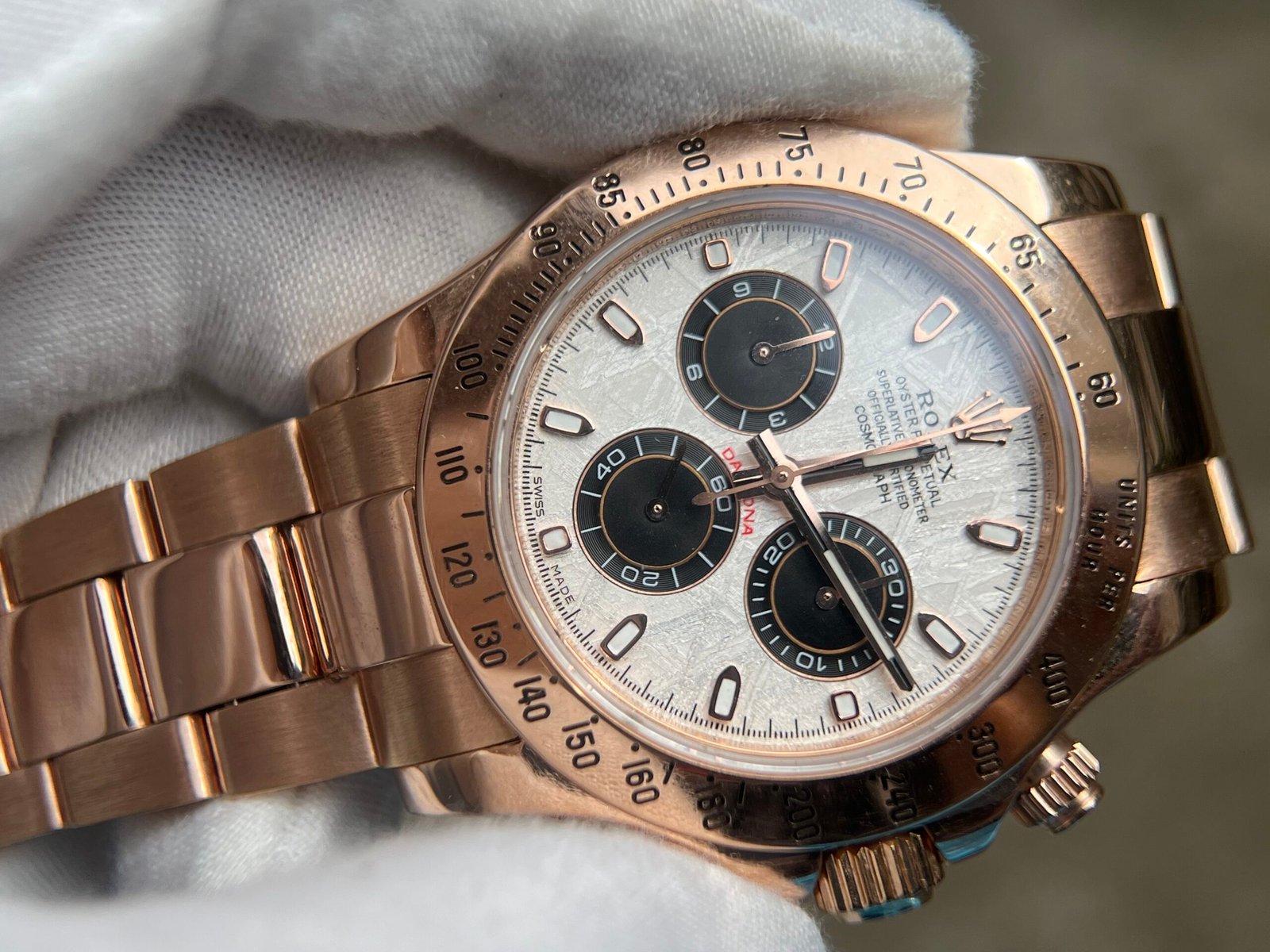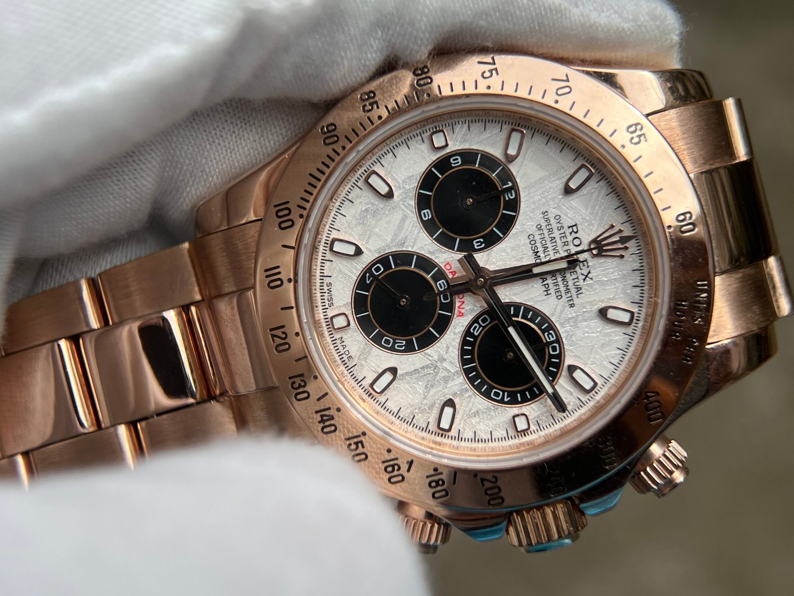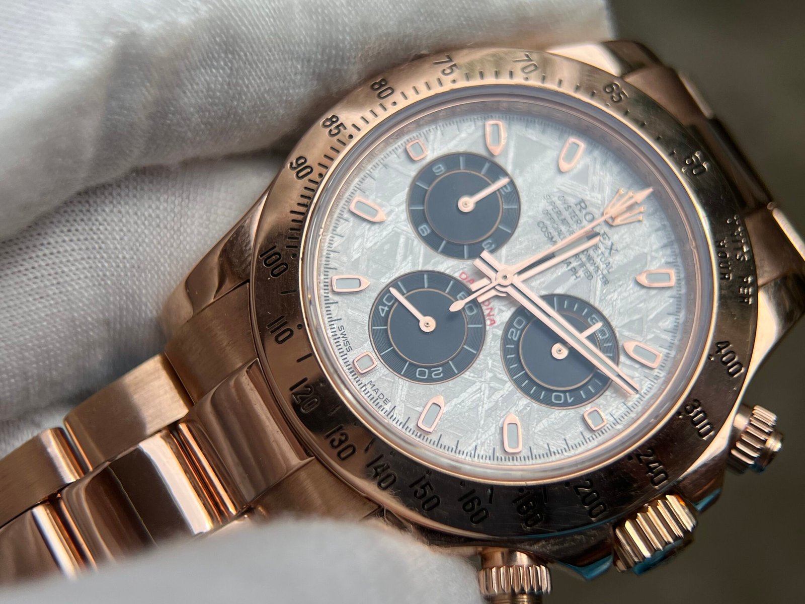 Case Material:Weight tungsten shell 950 Stamp Behind Case Lug (Wrap real Rose gold) Dial:Meteorite Dial Strap:Weight tungsten 750 with Deployant Buckle(Wrap real Rose gold) Crystal:Deep Sapphire Crystal, Same Thickness and Height above bezel as per Genuine (Etched Rolex emblem at 6:00 on the sapphire glass) Caseback:Tungsten case back (Wrap real Rose gold) Movement:Asian Super Clone4130 movement 28800vph, 1:1 replicated from the genuine movement, fully functional. Blue spring same as genuiine. Function:Hours, minutes, sub-seconds display and chronograph Water Resistance:>50 M