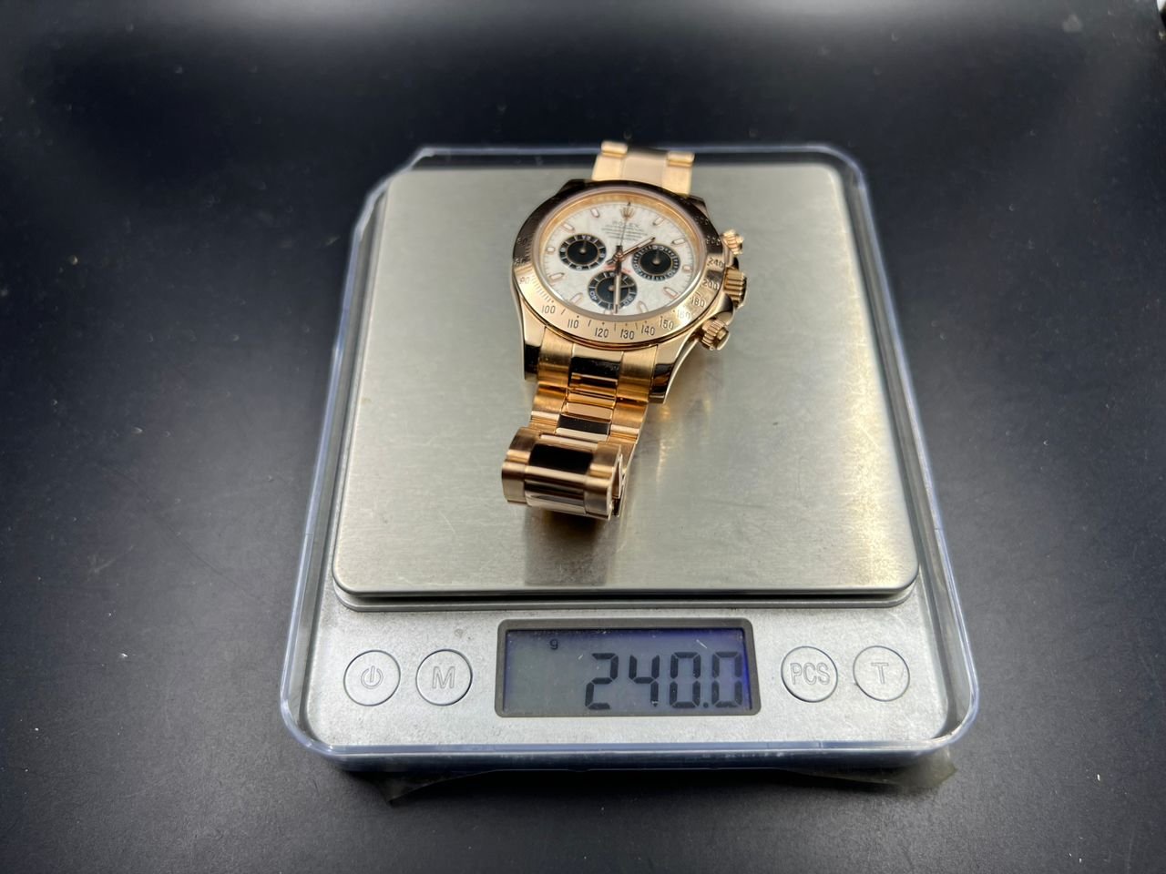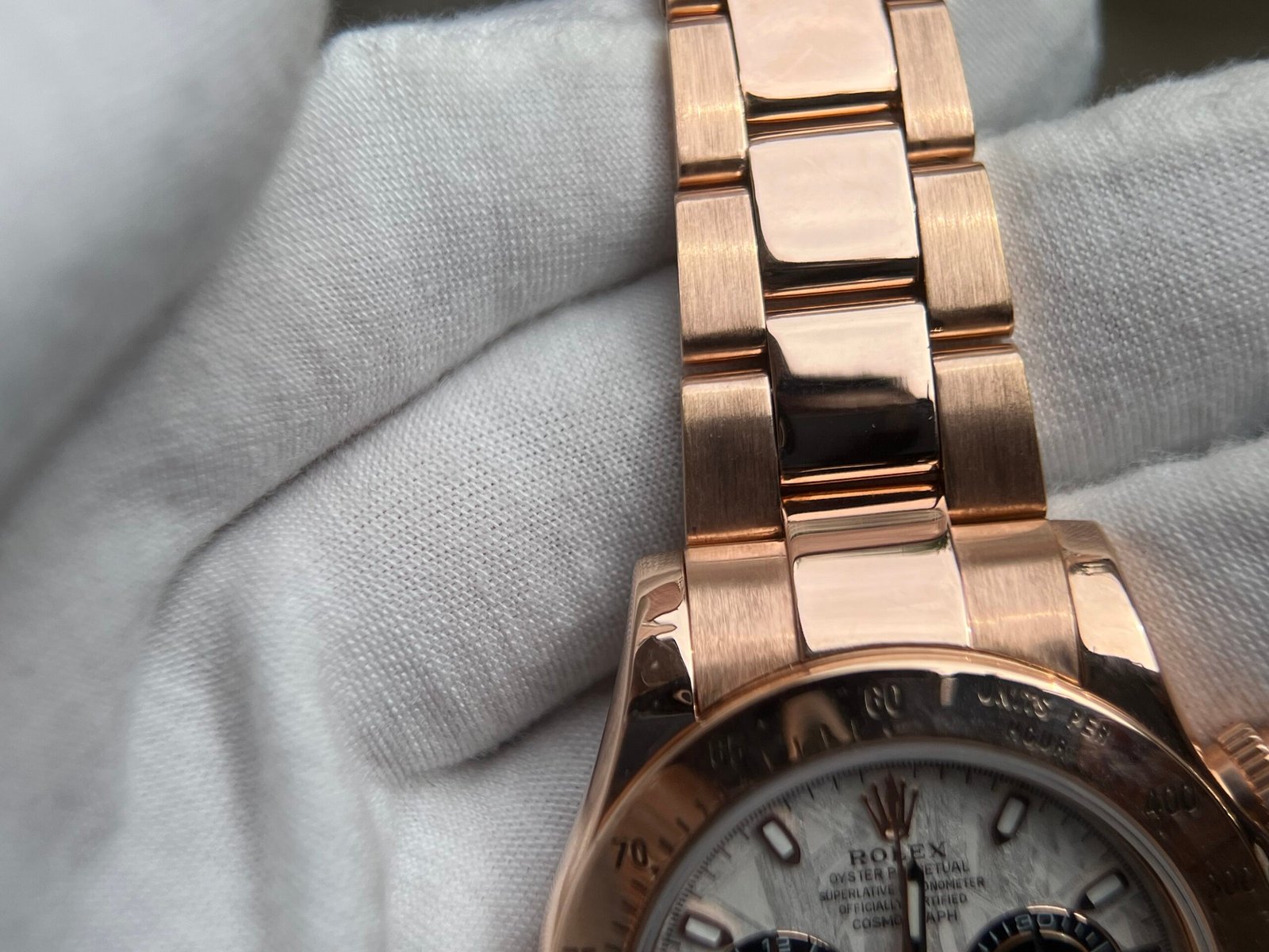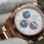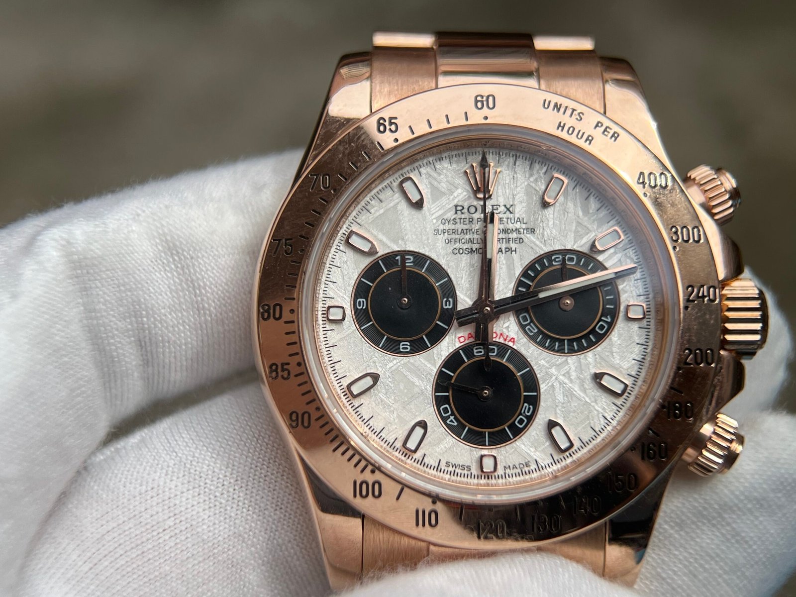 Case Material:Weight tungsten shell 950 Stamp Behind Case Lug (Wrap real Rose gold) Dial:Meteorite Dial Strap:Weight tungsten 750 with Deployant Buckle(Wrap real Rose gold) Crystal:Deep Sapphire Crystal, Same Thickness and Height above bezel as per Genuine (Etched Rolex emblem at 6:00 on the sapphire glass) Caseback:Tungsten case back (Wrap real Rose gold) Movement:Asian Super Clone4130 movement 28800vph, 1:1 replicated from the genuine movement, fully functional. Blue spring same as genuiine. Function:Hours, minutes, sub-seconds display and chronograph Water Resistance:>50 M