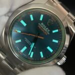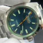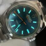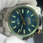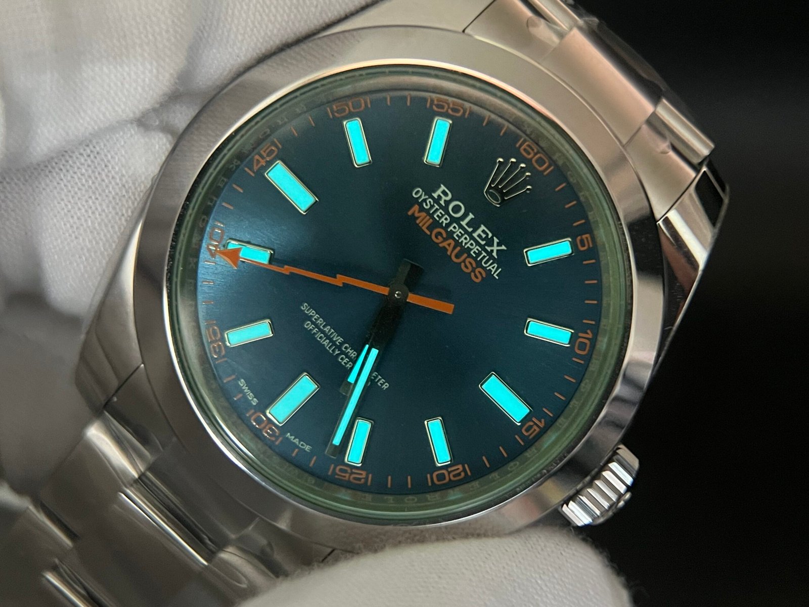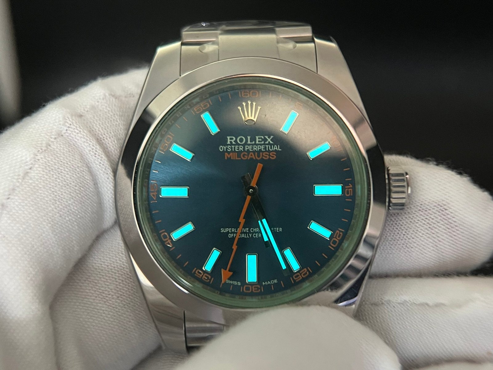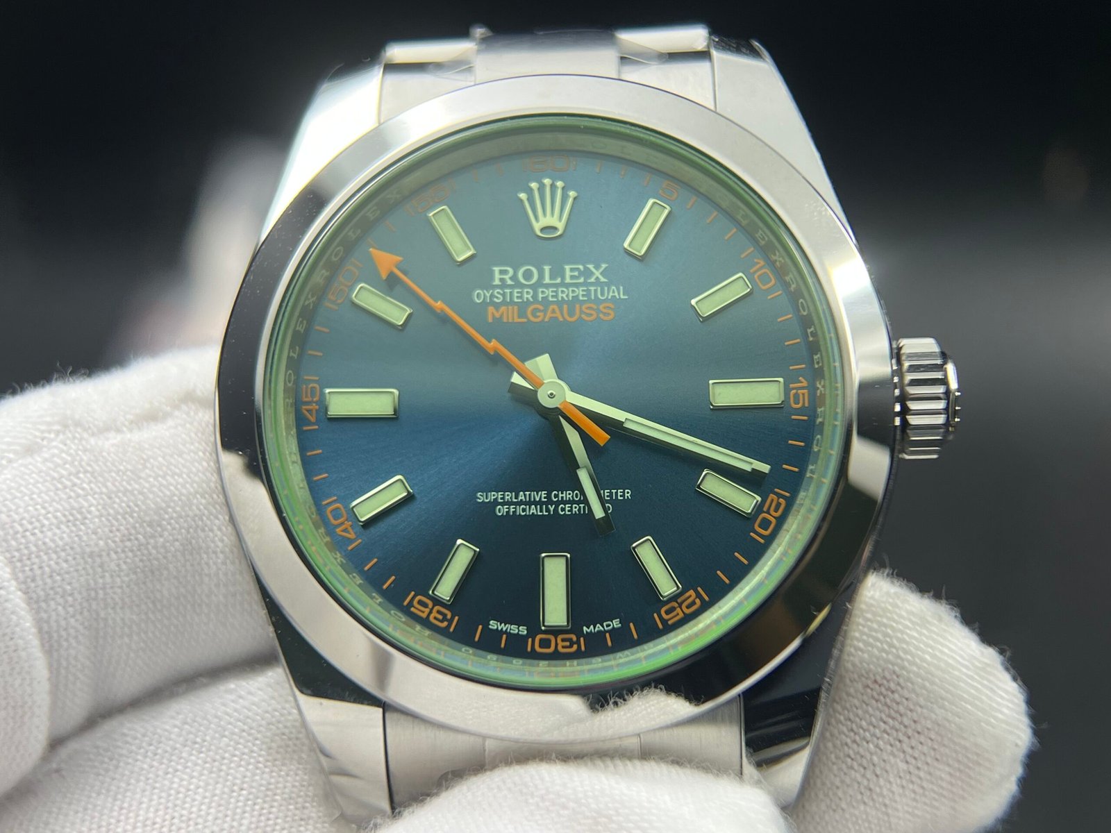 Dial:New Milgauss Black Dial with Pro-Hunter Insignia (Swiss Grade Superlume Blue on Broad Markers) – Dial has exact markings like Genuine even on the base plate (Vintage style Orange Lightning Hand)