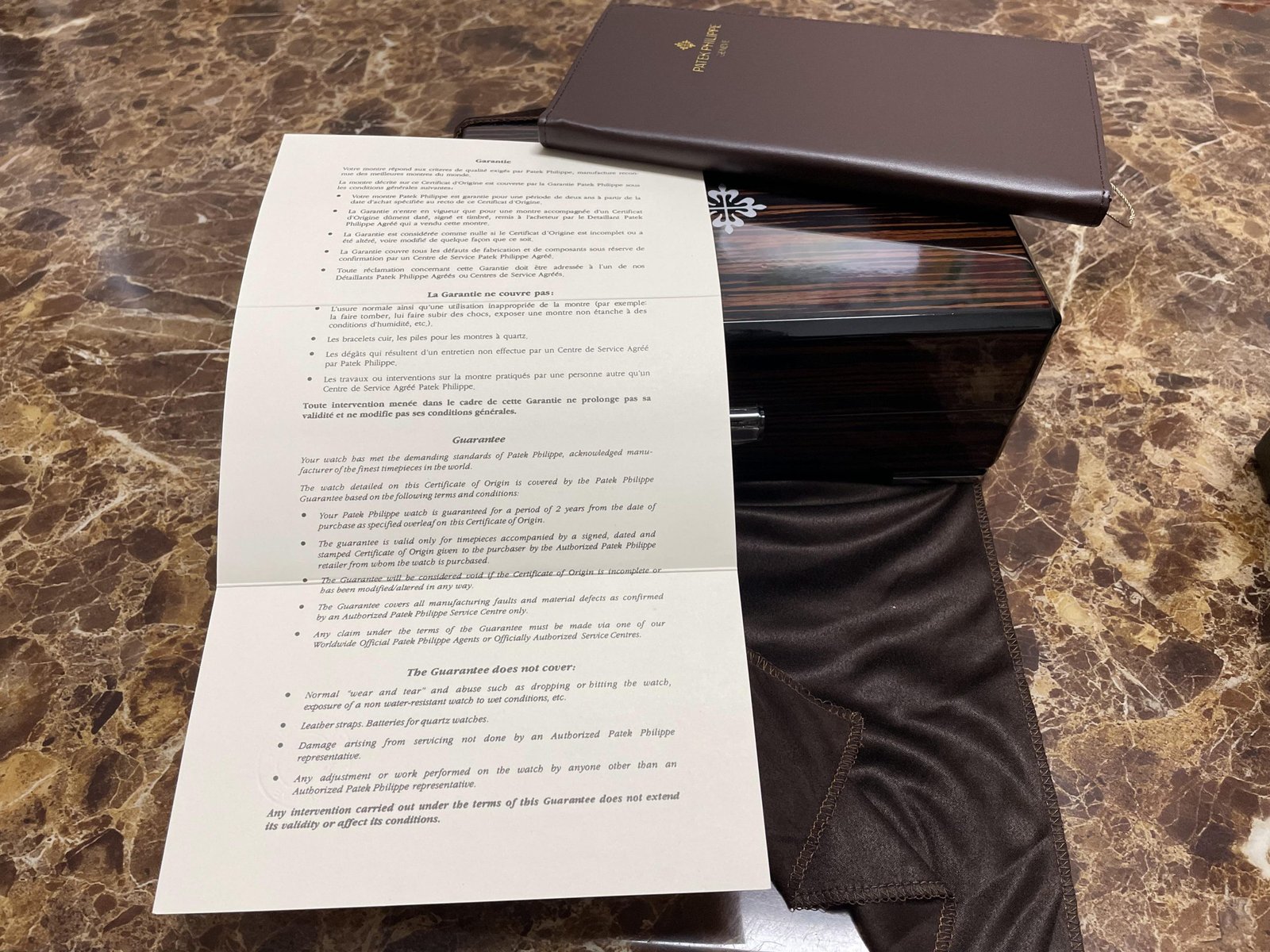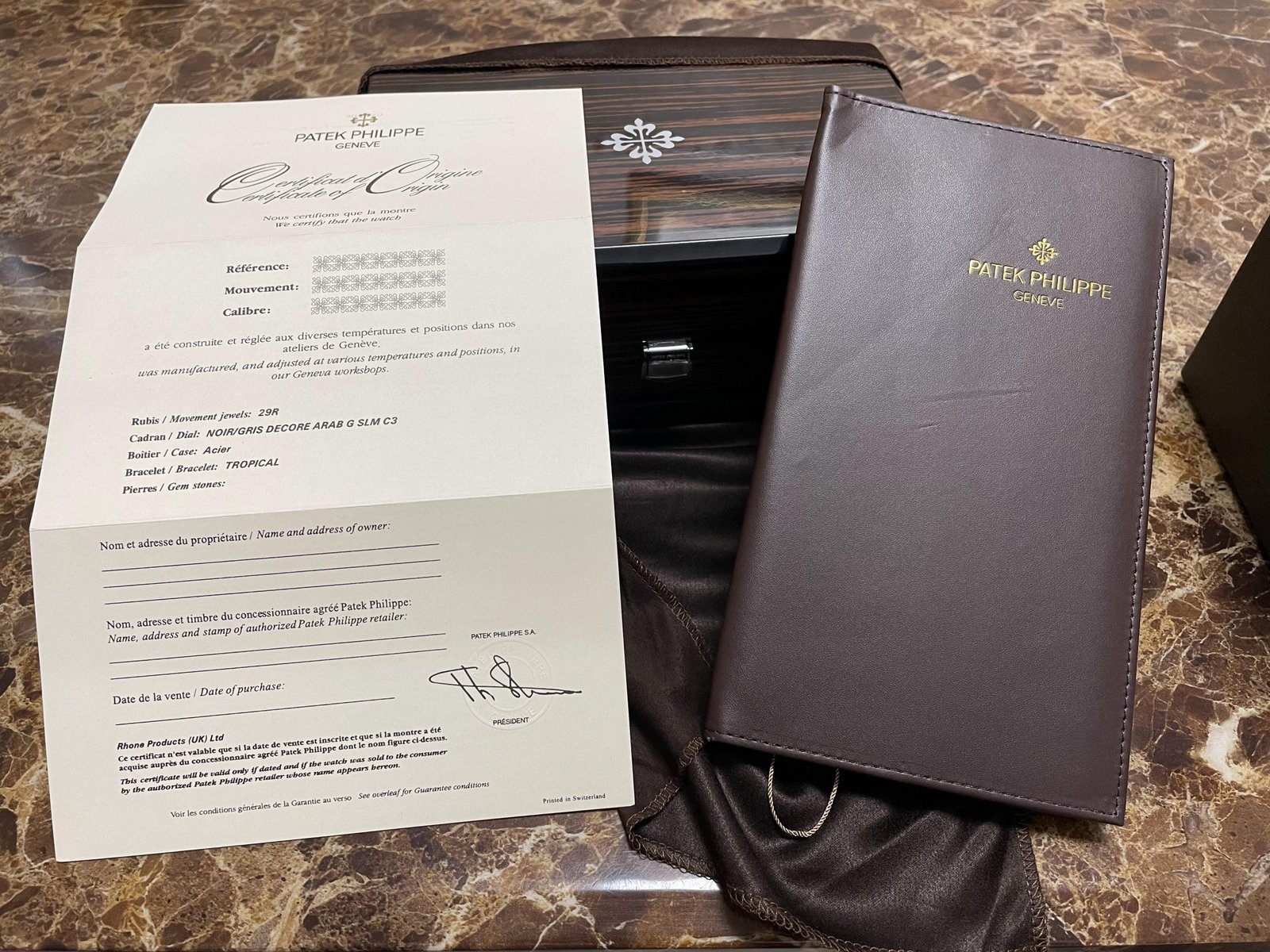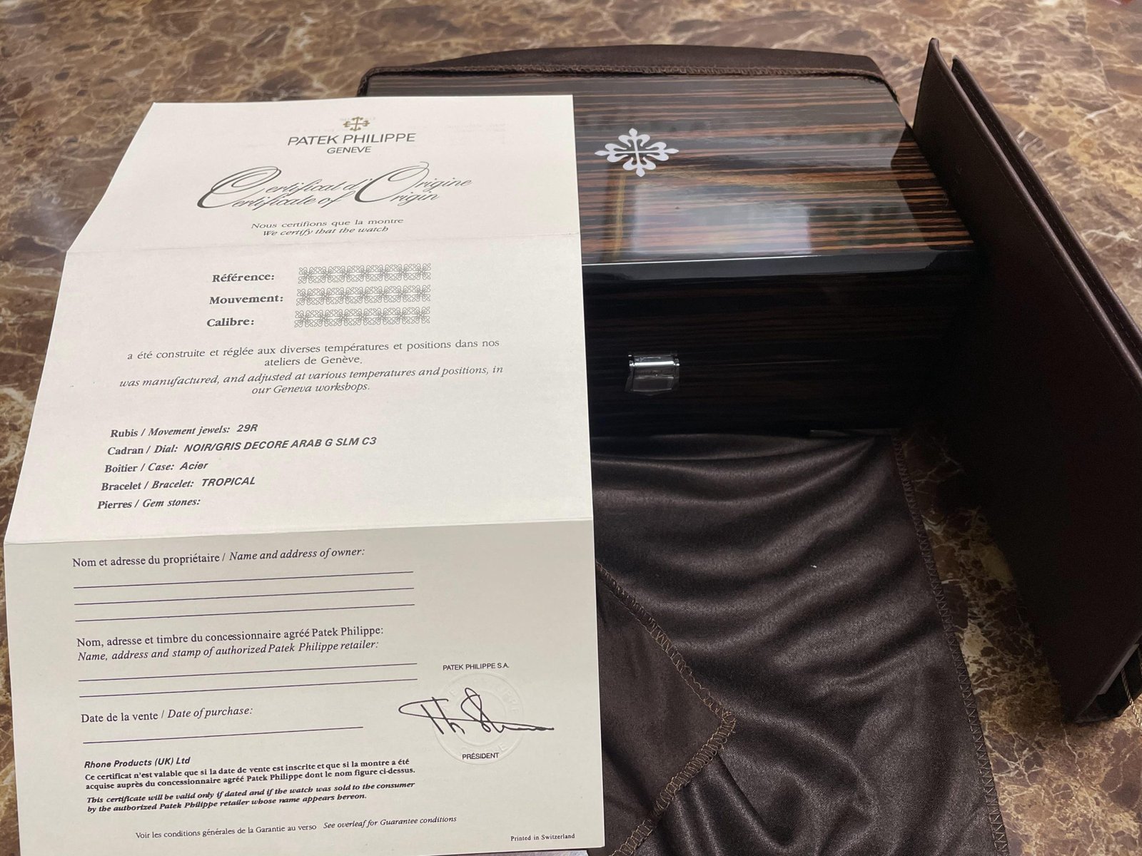 Original Design 1:1 with Dark Colored Decorative Card Paper Outer Box, Inner Mahogany Wooden Box with High Gloss Lacquer Finish with Patek Insignia